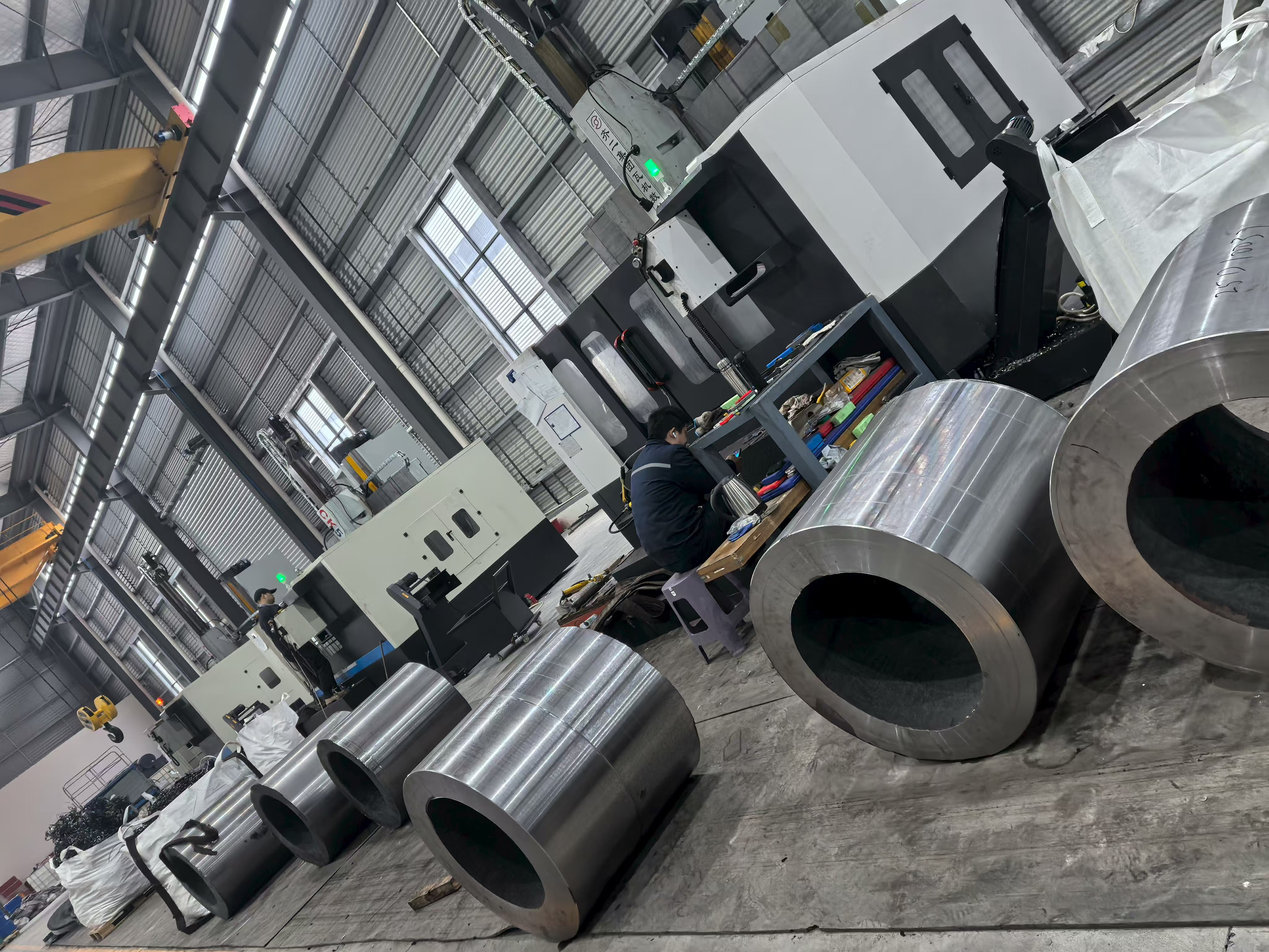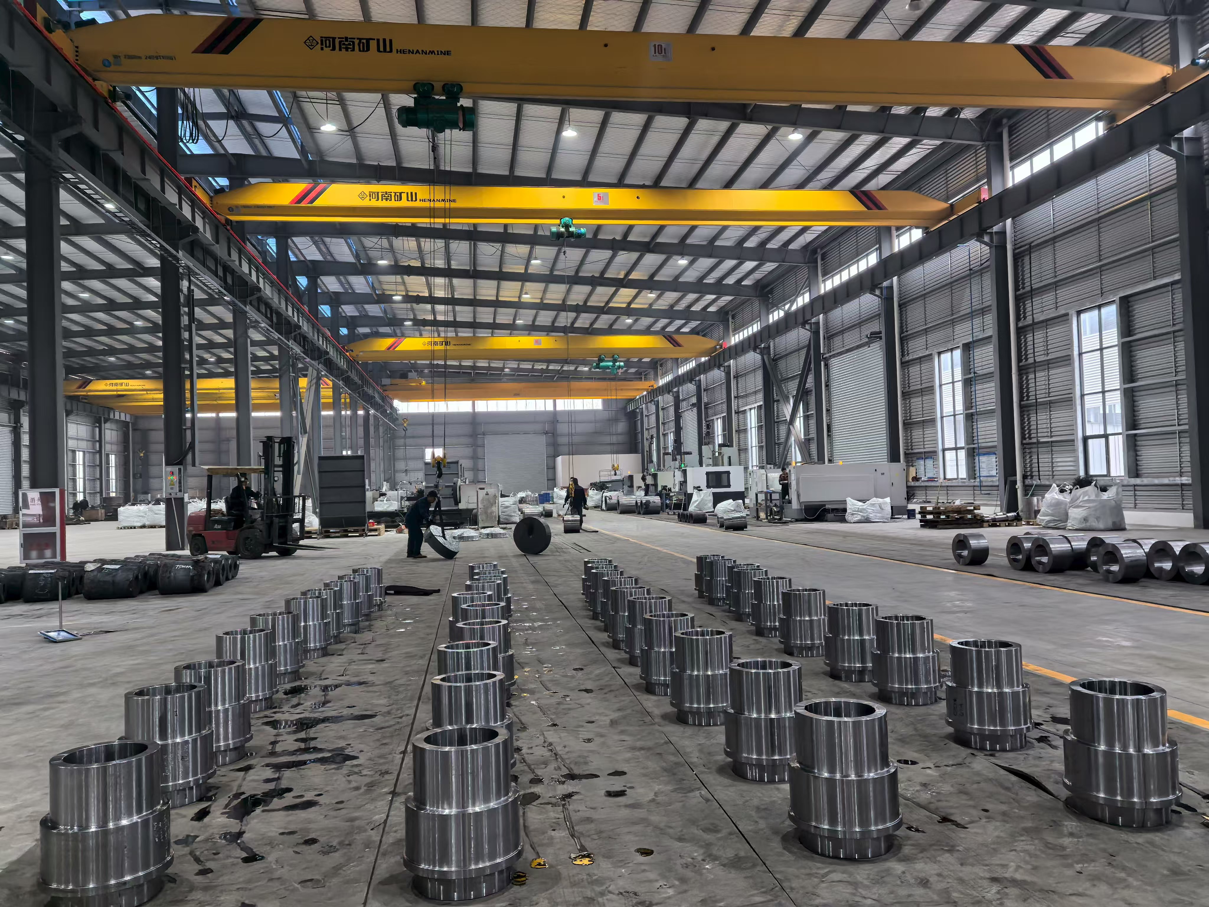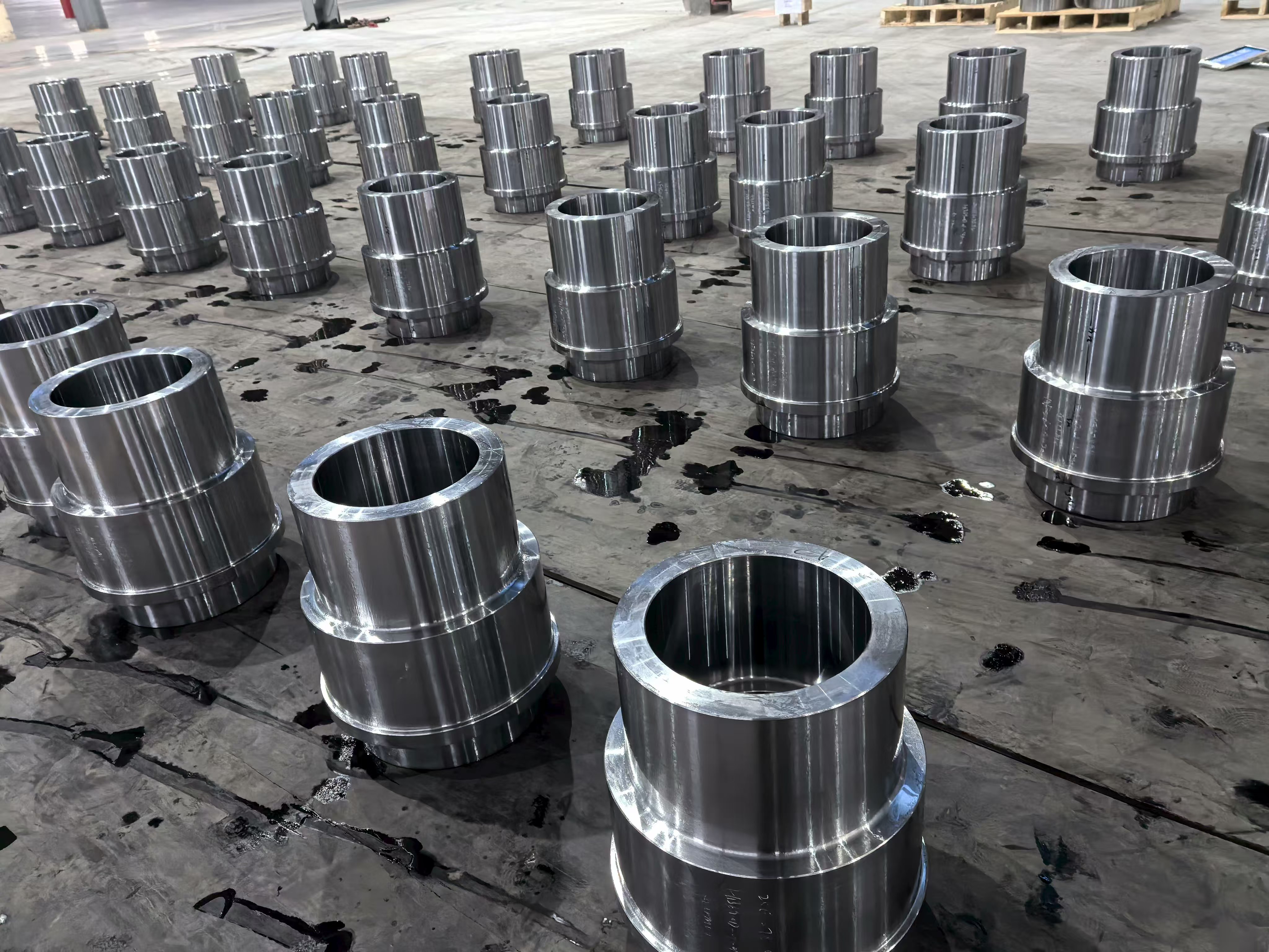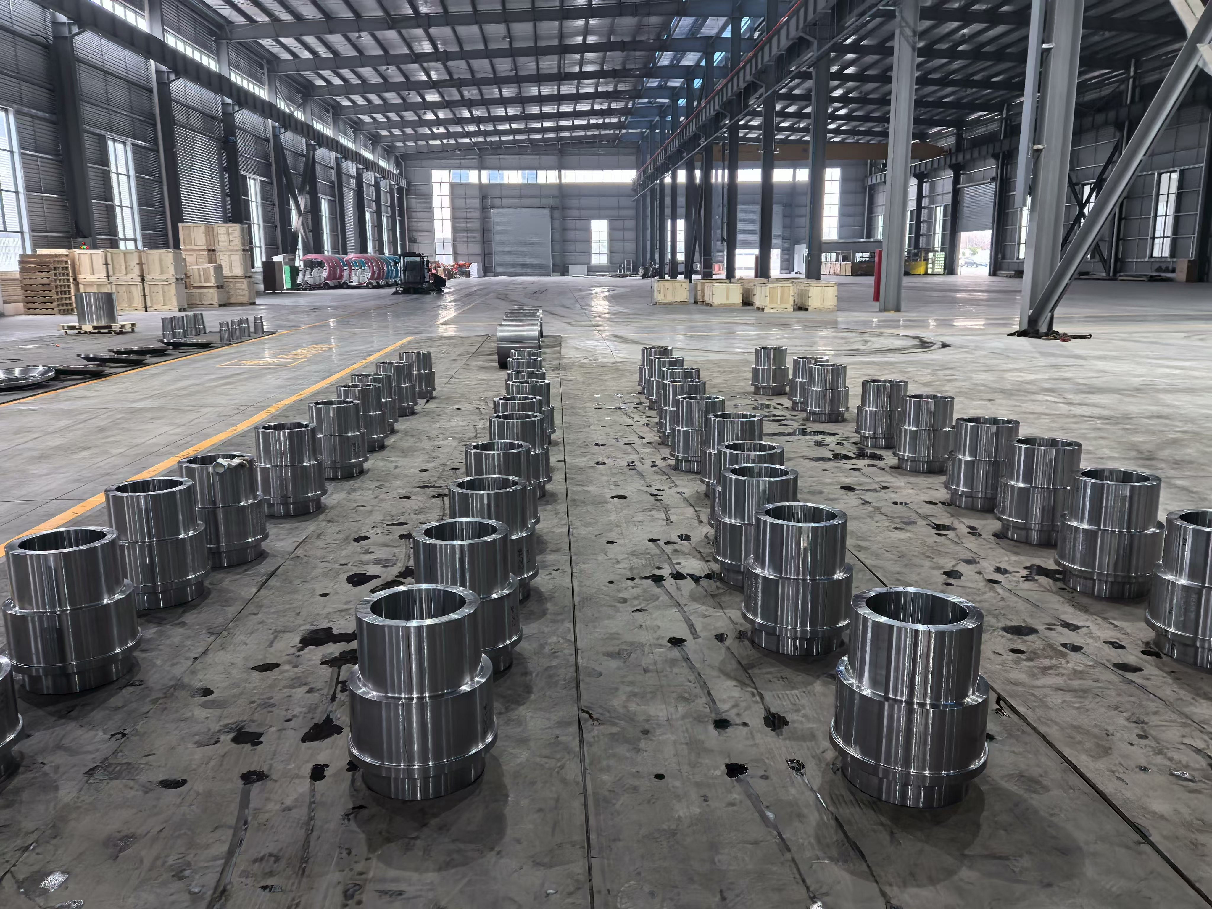 Slike pogona iz proizvodne baze prikazuju redove precizno strojno obrađenih čeličnih komponenata prstenova i glavčina raspoređenih po podu radionice u organiziranim serijskim rasporedima — vizualno svjedočanstvo mogućnosti proizvodnje velike količine grupe. Svaka komponenta pokazuje dosljednu završnu obradu površine, ujednačenost dimenzija i strogu toleranciju koja je rezultat kombiniranja kovanja, toplinske obrade i CNC strojne obrade unutar jedinstvenog integriranog proizvodnog sustava. U radionici za strojnu obradu nalazi se više CNC tokarskih i obradnih centara koji rade istovremeno, s obradcima u rasponu od cilindričnih rukavaca velikog promjera do složenih sklopova glavčina s prirubnicama.